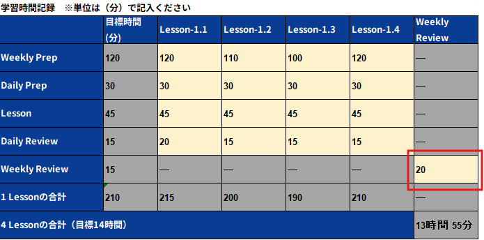 ワークシートの「学習報告」タブにWeekly Reviewにかかった時間を記入してください。