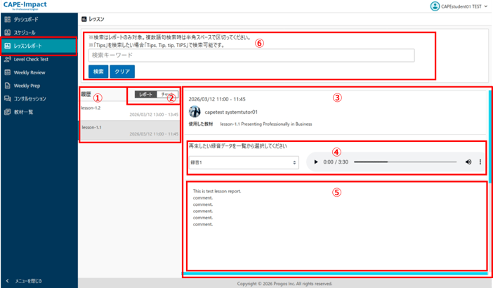 レッスンレポート、チャット履歴、レッスン音声を確認することができます。