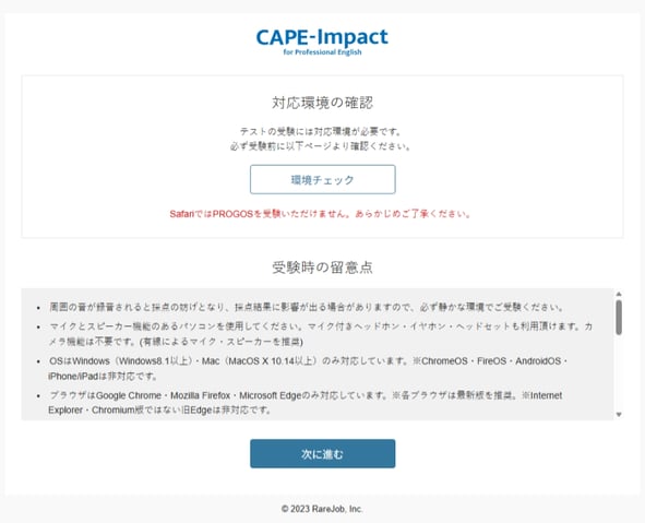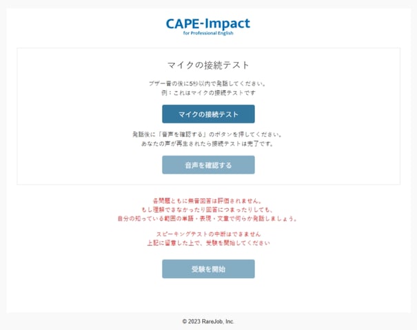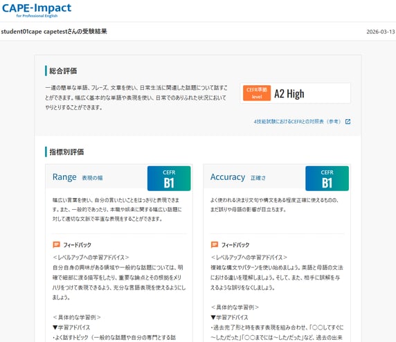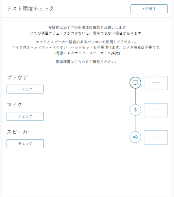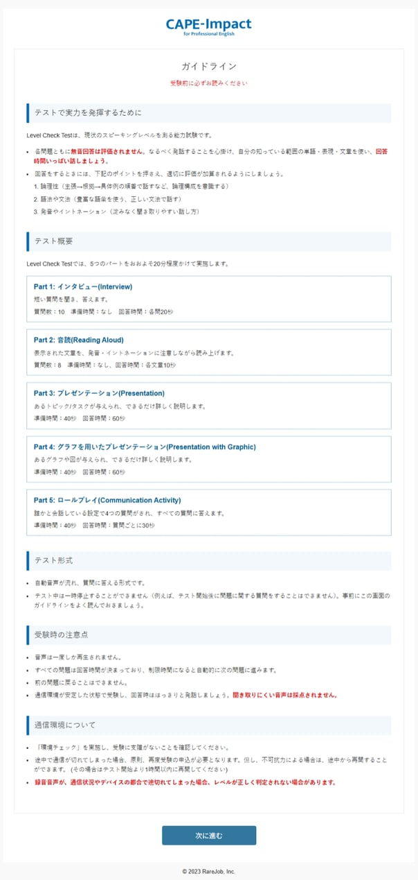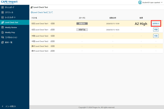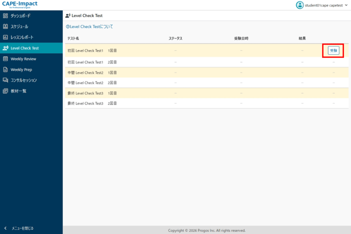 左メニューの「Level Check Test 」を選択してテストの受験・一覧ページへお進みいただき、「受験」ボタンを押下してテストを開始してください。